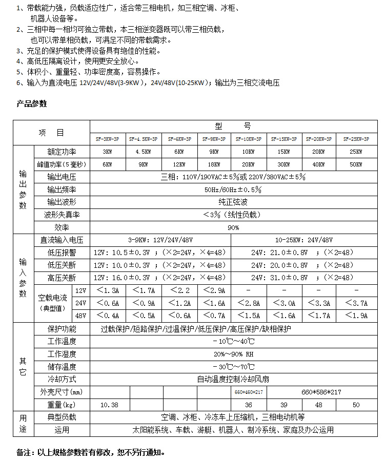 三相高頻正弦波逆變器規格參數(3-25KW)